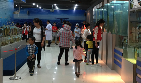 连云港恒星特殊儿童益智园是连云港市首家为特殊儿童进行康复训练及学前教育的民办机构,为迎接这群特殊的客人到海洋馆参观,5月18日下午,全体支部成员统一作工作服,配带党徽提前在海洋馆等候。当志愿者把益智园的儿童和家长带到海洋馆后,大家分头迎接,并为小观众进行海洋生物知识讲解,他们重点介绍了我国一级保护鱼类中华鲟的生长、发育、生殖洄游等习性,大闸蟹的生长、发育及与中华鲟相反的生殖洄游。党员叔叔们生动幽默的讲解引起小观众的极大兴趣,当介绍海龙、海马虽不叫鱼,但都是真实的鱼类且是“爸爸”们“怀胎”育儿时,引起阵阵笑声。