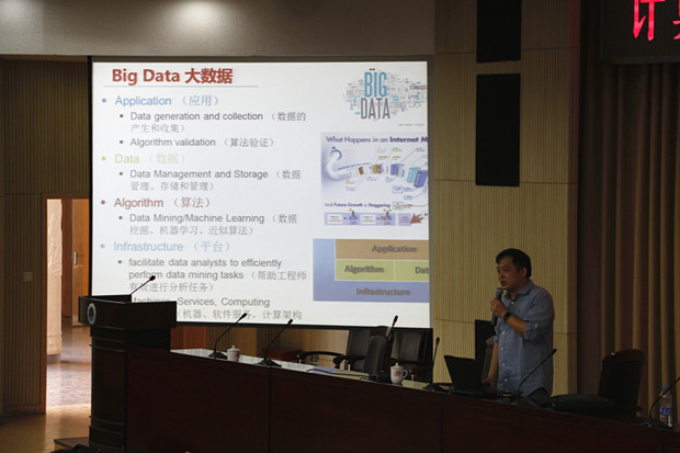 李涛教授做了题为“大数据时代的数据挖掘”的精彩学术报告,李涛教授以自己科研团队的工作为基础,介绍数据挖掘在几个研究方向上(系统日志分析、恶意软件检测、文本挖掘、空间数据挖掘、推荐系统)的理论算法和应用实践。整场报告会气氛活跃,大家不时对李涛博士渊博的知识报以热烈掌声。