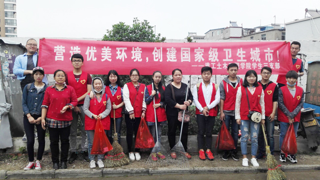 5月21日上午,土木工程学院学生第三党支部组织学生党员、发展对象20余人,围绕“两学一做”学习教育主题,分两个小分队分赴刘艞社区、苍梧绿园开展“争创国家卫生城市你我共享美丽港城”主题教育实践活动。