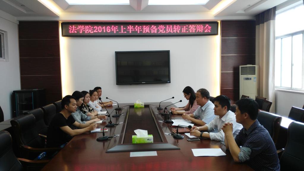 5月25日下午,法学院在学院会议室举行2016年上半年预备党员转正答辩会。答辩会由党政办公室主任高勇同志主持,法学院党委书记朱国良、学生党支部书记崔家新、蒋莹莹参加答辩。