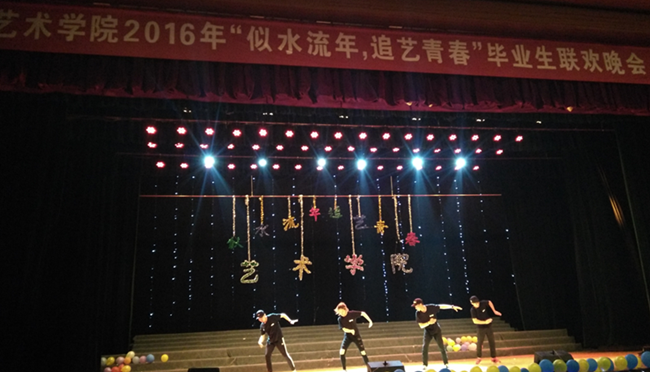 这是追忆青春的季节,也是梦想扬帆起航的季节。在这栀子花开的离别之际,由艺术学院主办的2016年“似水流年,追忆青春”毕业生晚会在毕业红毯秀后隆重举行。晚会在荧光舞中拉开序幕,该舞蹈新颖别致,科技感强,表达感人;ME街舞艺术团的舞蹈《Can’t Stop The Feeling》欢快热烈、激情四射,遒劲的舞姿尽显青春魅力;艺术123班的合唱《青春纪念册》勾起大家对大学四年生活的美好回忆,毕业生带来的《遇见你的时候星星都落到我头上》、《同桌的你》、《一起老去》、《那些年》等歌曲将大学友情、爱情娓娓道来,唱出了毕业生对大学四年的依恋,对母校的不舍。晚会在进行过程中,有15届毕业生王佩学长亲临现场送来的毕业祝福,有父母远程来电送来的祝福和对老师们的感谢,有学院领导、老师们和优秀毕业生们送来的“全心全艺的祝福”,师生一起共忆美好过往。