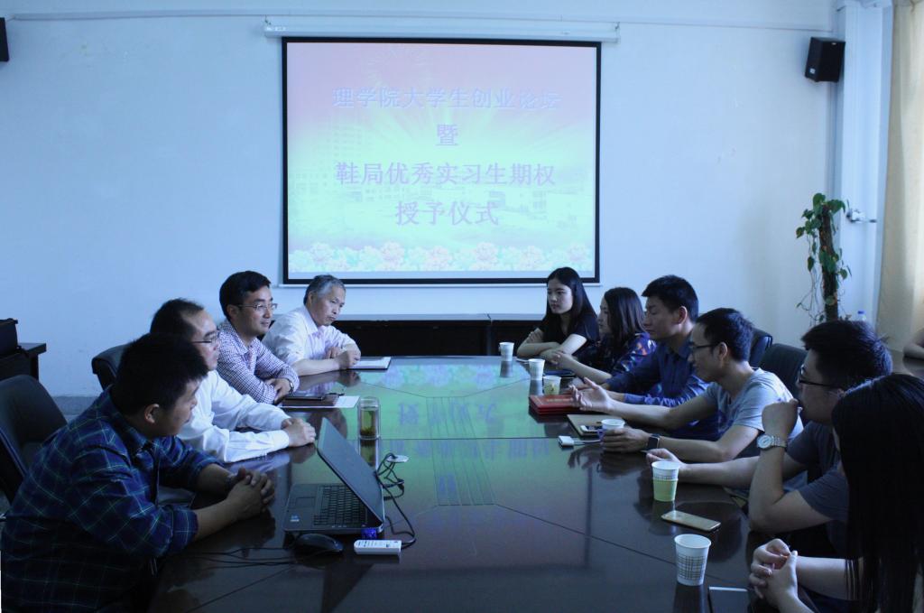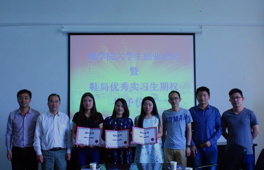 6月6日上午,理学院与鞋局公司举办的优秀实习生期权授予仪式在学院小会议室举行,鞋局公司创办人王文前、谢成亮、邵凯,理学院领导王恒明、吕小光、陈德翼,2016届毕业生王花、周丽珠、张薇以及学院部分师生代表出席了仪式。