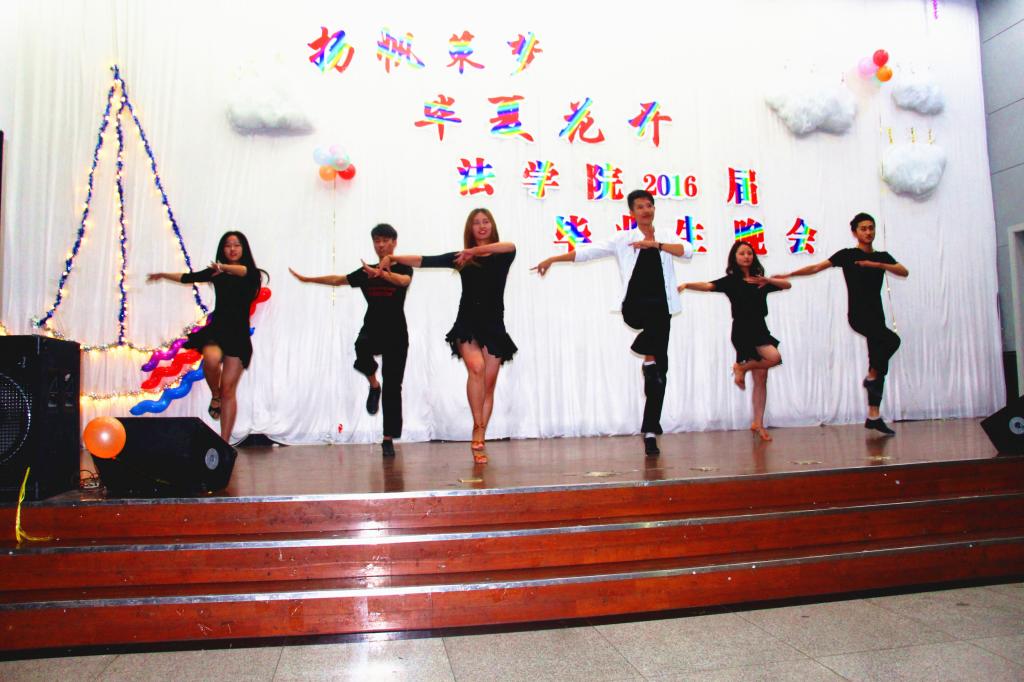 一首首熟悉的歌曲回荡在舞厅中,《see you again》、《曾经的你》、《讲不出再见》……歌曲串烧激起同学们的共鸣,都随着演唱者打起节拍来;舞蹈《circle》以及拉丁舞表演更是用跳动的舞步为毕业生们送上最美的祝福;小提琴独奏《渔舟唱晚》则叙说着丰收的故事。法学院党政领导用各自家乡话诠释着《再别康桥》,欢笑全场,用欢乐冲刷掉离别的哀愁与不舍的留恋。情景剧《一起走过的青春》演绎四年的宿舍深情,韩语歌曲《眼鼻嘴》,异域歌曲同样述说着离别的不舍。