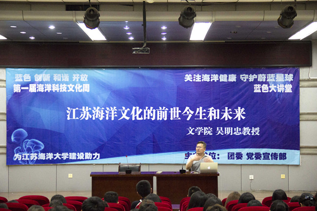 近日,淮海工学院第一届海洋科技文化周系列活动之蓝色大讲堂第一期在苍梧校区艺术楼报告厅举行,文学院院长吴明忠教授以“江苏海洋文化的前世今生和未来”为题进行讲座。