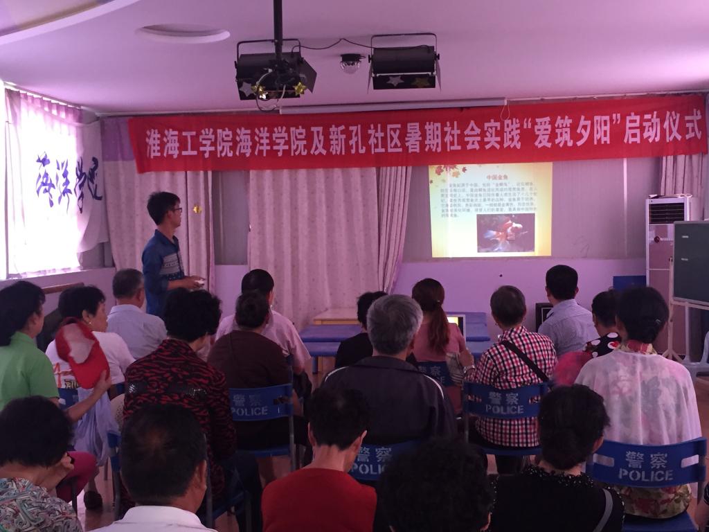 6月16日下午2点,海洋学院“爱筑夕阳”暑期社会实践活动启动仪式在新孔社区幼儿园隆重举办。海洋学院党委副书记马志同、海洋学院团委副书记王静、新孔社区居委会代表杨贤惠及新孔社区的三十多位老人们出席了本次启动仪式。