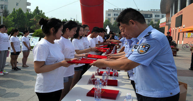 活动现场,杨德祥副局长等领导为淮海工学院禁毒志愿者、连云港开放大学禁毒志愿者颁发了聘书。全体禁毒志愿者在学生代表蔡高甜的带领下进行宣誓,以表明作为中华民族儿女的我们,积极开展禁毒宣传活动,坚决与毒魔作斗争,不吸毒,不贩毒,不制毒,不种毒的强大决心以及为禁毒事业献出青春,智慧和力量的坚定毅力!随着杨德祥副局长一声令下:“出发” !50名大学生禁毒志愿者和50名社会禁毒志愿者通过百人公益骑行的形式开展本次禁毒宣传活动,以切实提高防范和抵制毒品的自觉性,进一步增强全民防毒、拒毒意识。