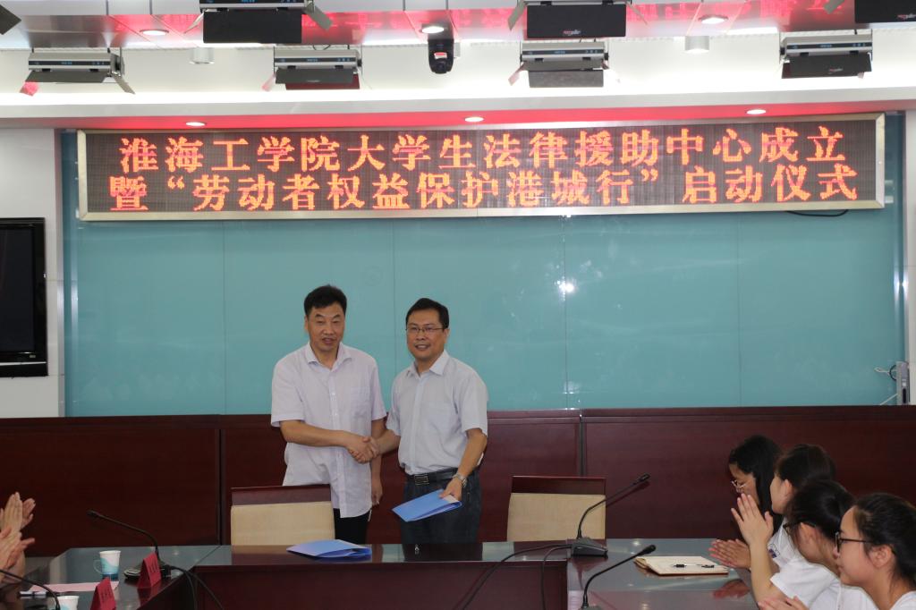 随后,校团委书记朱国军宣读成立淮海工学院大学生法律援助中心的决定,市法律援助中心主任张龙江与法学院党总支副书记、副院长黄金虎签订共建淮海工学院大学生法律中心协议。市司法局副局长薛玉江、法学院党总支书记朱国良为淮海工学院大学生法律援助中心揭牌。