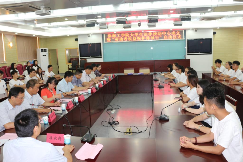 7月8日上午9时,淮海工学院大学生法律援助中心成立暨“劳动者权益保护港城行”启动仪式在校学术会议中心东海厅举行。市司法局副局长薛玉江、市法律援助中心主任张龙江、市总工会法律工作部副部长易怀丽、校团委书记朱国军以及法学院党政领导出席本次启动仪式,法学院党总支副书记、副院长黄金虎主持仪式。