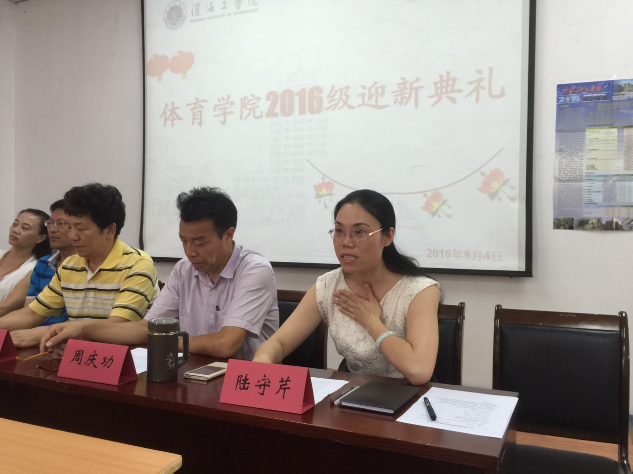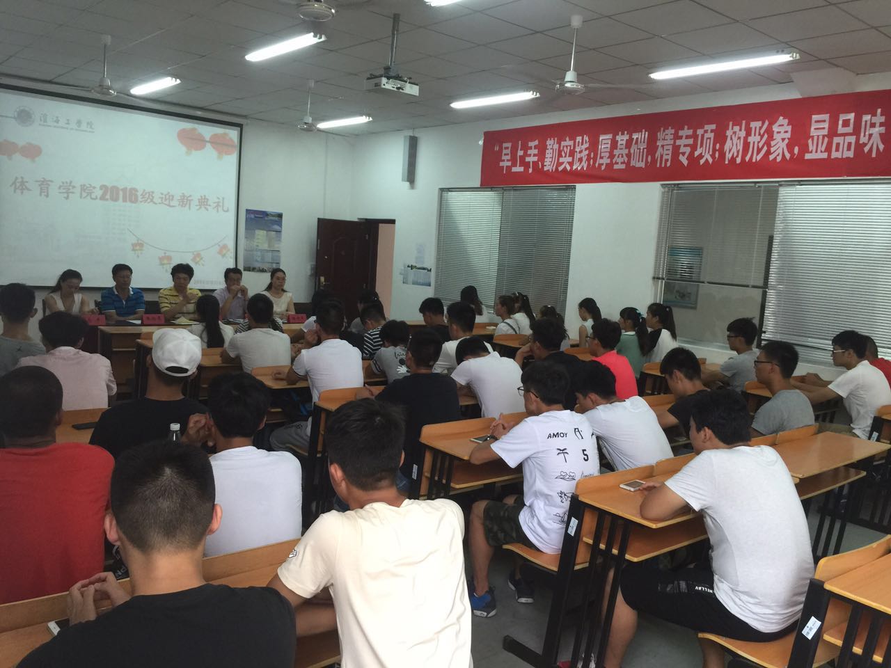 一年一度的迎新工作在节日般的氛围中顺利进行,体育学院迎来39名2016级新同学们,新生们英姿勃发,为美丽的淮海园又增添一道亮丽独特的风景线。为迎接休闲体育专业同学们的到来,体育学院于2016年9月4日上午8:30举行2016级迎新典礼活动,体育学院党总支书记刘传祥、体育学院院长周庆功、体育学院副院长张伦厚、休闲体育系系主任马彦、班主任陆守芹及班主任助理郭丹丹及全体新生们参加了本次活动。