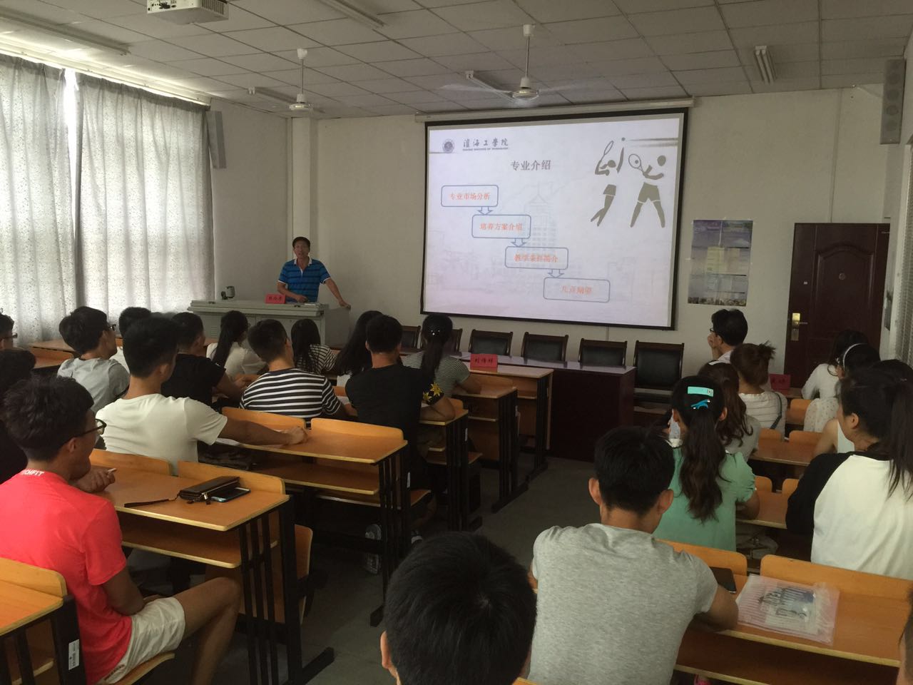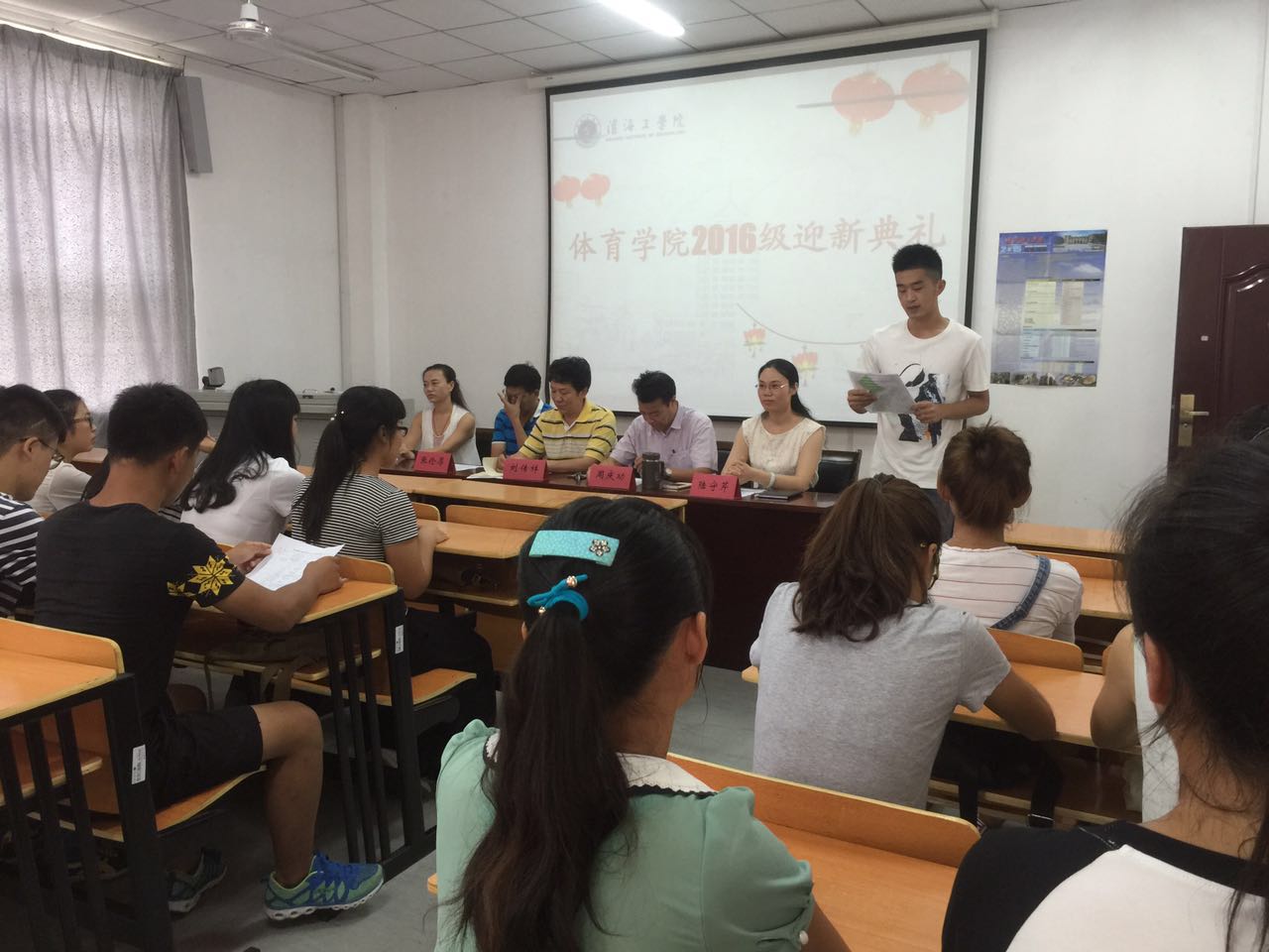 迎新典礼由体育学院院长周庆功老师主持,周院长首先介绍了与会的领导和老师,并表达了对新生们的热烈欢迎,并宣布典礼活动开始。典礼程序第一项,由班主任陆守芹老师讲话,从中学学习到大学学业,从学习生活到人际交往,陆老师如一位慈母的向同学们传递温暖与忠告,每一句谆谆教诲都深入新生们的心中。典礼程序第二项,由新生代表陈天尧同学发言,陈天尧同学表述了自己亲临淮海园的感受,新生报到的每一处细节都体现了集体的互助和友爱。典礼程序第三项,体育学院党总支书记刘传祥老师发言,刘书记说:随着休闲61班同学们的到来,体育学院四个年级的学生完整了,我们已经告别中学,离开陪伴自己的父母,离开家乡,在淮海园组建成了新的家庭,休闲体育学子要做到“早上手、勤实践,厚基础、精专项,树形象、显品味”,要努力做一名有涵养、有品味、有能力的高素质体育人,美好的未来等着我们。典礼程序第四项,由体育学院副院长张伦厚老师做专业介绍,张老师从我国高校休闲体育专业设置变化情况开始,解读休闲体育专业培养目标与方案,并向全体新生们提出四点期望:(1)管理好自己,管理好生活和学习;(2)珍爱自己,把握自己,勿空度自己的光阴和生命;(3)专业理论、技能、实践并进,专项突出;(4)与周围的人、社会、环境和谐共处,成为对社会和家庭有积极作用的人。