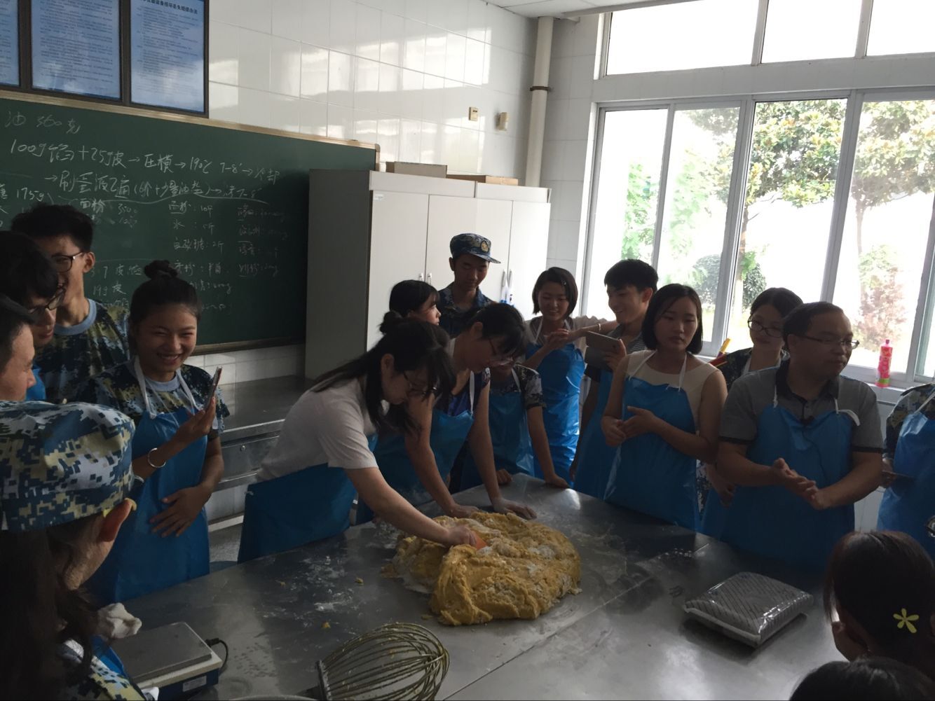 月饼制作伊始,盘赛昆老师耐心细致地向同学们介绍了月饼制作的工序及各材料用量。实验台上摆满了面粉和月饼的馅料,新生们围绕着老师,认真地听着讲解,看着示范,还时不时地小声讨论着……