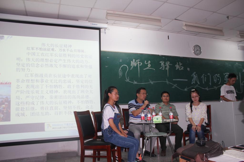 活动以师生面对面交流的方式,从长征精神展开。黄金虎副书记、崔家新老师从不同侧面分别阐述了对长征精神的理解,认为,长征精神代表着坚韧不拔,不怕吃苦的精神,希望同学们以军训为契机,培养爱国主义精神,拥有爱国主义情怀,尽快适应大学校园生活。随后,一段军训的影像记录,将同学们重新带回了火热的军训现场,教官与学生之间的欢乐时光,同学们之间深厚的友情,总是那么让人无法忘怀,同学们踊跃分享着与教官的美好回忆,以及对辅导员老师表现出的爱护与关心的感激之情,全体同学合唱《强军战歌》更是将活动推向高潮。