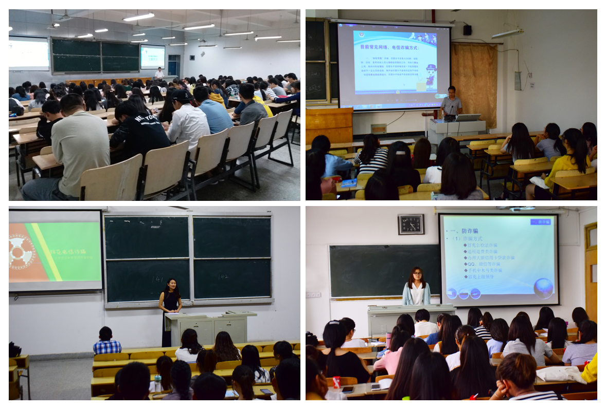 根据学校的要求与部署,应用技术学院第一时间召开了“学生防诈骗”班主任工作专项会议,传达《教育部思政工作司关于组织参加2016年国家网络安全宣传周活动的函》与《省教育厅办公室关于做好高校学生防诈骗安全教育工作的通知》等有关文件精神,布置落实校“学生防诈骗专题教育活动月”实施方案,制定实施细则,进行任务分解,明确责任要求。在此基础上,该院各班级于9月21日晚在各自班会教室召开了学生防诈骗主题班会。通过集中观看预防电信诈骗宣传片、校园常见电信诈骗案例分析与讨论、防范电信诈骗顺口溜等形式增强大学生安全防范意识,明确学生人身财产安全注意事项,提高学生化解和应对风险的能力。