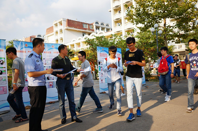 9月22日,校保卫处联合连云港公安局网安支队,在苍梧校区一食堂门前开展以“提高警惕,防范诈骗”为主题的安全宣传活动。网安支队五名干警、校保卫处治安科工作人员以及学生会纪安部成员参加了此次活动。