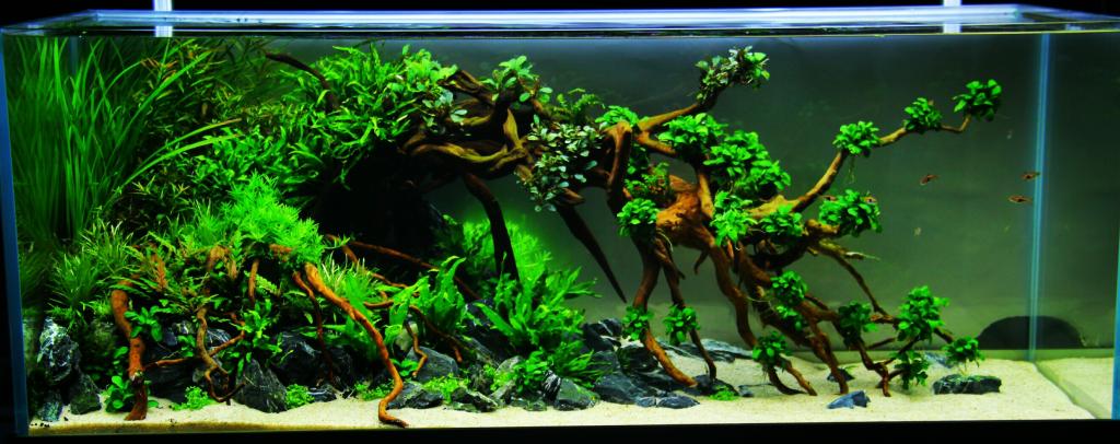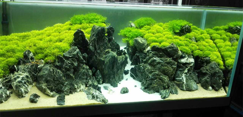 二等奖作品《生命的韧劲》是一件南美亚马逊风格的作品,展现了一棵倒下的老树获得重生的故事。利用青龙石、沉木和杜鹃根搭建骨架,以莫斯、矮珍珠、水剑、细叶皇冠、绿宫廷、迷你小榕等水草表现生命的绿色,讴歌了生命的生生不息。