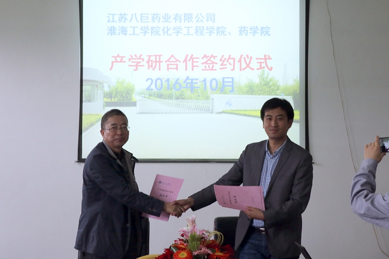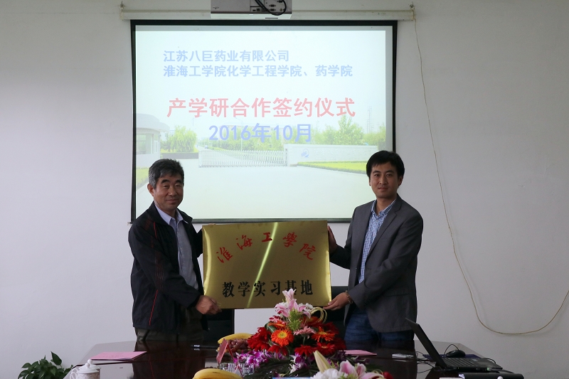 仪式开始前,宾主双方分别介绍了校企基本情况,就进一步开展产学研和人才培养合作进行了友好洽谈,公司技术部部长助理程焕达等3名校友还向大家汇报了自己的成长经历和工作情况。化学工程学院刘新河、药学院党总支书记钱保华代表学校和江苏八巨药业有限公司总经理楚玮明在合作协议书上签字,并为八巨药业成为我校“教学实习基地”挂牌。会议还签订了“八巨药业奖学金”协议书,根据协议,江苏八巨药业有限公司每年提供2万元,专项奖励我校化工制药大类各专业学习优良、家庭困难的学生。