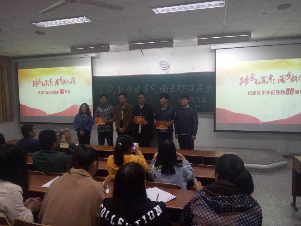 10月25日晚,法学院在通灌校区TZ410举办了“忆峥嵘岁月,颂长征风采”诗歌朗诵比赛。有7个班级8支代表队参加了比赛,最终法学161班代表队拔得头筹,法学162班代表队位列第二,行管151班代表队获得第三名。每支参赛队伍的精彩表演不时赢得阵阵掌声。穿插其中的知识问答,更是引来了同学们的积极参与,使同学们对红军长征胜利的伟大意义、宝贵经验、艰苦卓绝的历程以及红军长征在中国革命史和我军军史上的重要地位有了进一步的了解。最后,经过精心制作的一段视频更是让同学们对红军长征的光辉历程和英雄壮举有了更直观的认识,使大家的心灵受到了强烈的震撼。