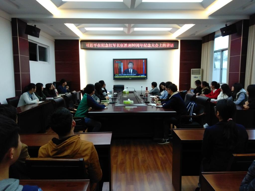 10月21日,法学院组织学生党员、入党积极分子在法学院会议室集中观看习近平总书记纪念长征胜利80周年讲话实况直播。习近平总书记发表的“弘扬伟大长征精神,走好今天的长征路”重要讲话,让当代大学生真切领悟了伟大的长征精神,带给他们心灵震撼的同时,也使他们对当前美好生活的来之不易以及自己肩上的责任有了更深刻、更全面的领悟。