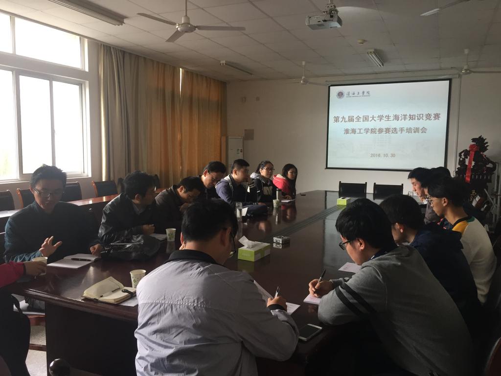 为深入贯彻“建设海洋强国”和“21世纪海上丝绸之路”的战略部署,落实习近平总书记“要进一步关心海洋、认识海洋、经略海洋”的指示精神,引导青少年学习海洋知识、增强海洋意识,为实现中华民族伟大复兴而奋斗,国家海洋局、共青团中央、海军政治工作部共同主办了第九届全国大中学生海洋知识竞赛。在我校团委、学生会的大力支持下,作为丝绸之路经济带和21世纪海上丝绸之路的交汇点和“桥头堡”连云港的淮海工学院大学生代表,海洋生命与水产学院海科151班级叶琦同学参加了本次大赛并成功进入全国决赛圈。2016年10月30日上午,海洋生命与水产学院开展了第九届全国大学生海洋知识竞赛淮海工学院参赛选手培训会。学校团委郭戈老师、校学生会代表、海洋生命与水产学院团委副书记王静、海洋科学系多位教师及小企鹅海洋保护协会感兴趣的同学参加了培训会。