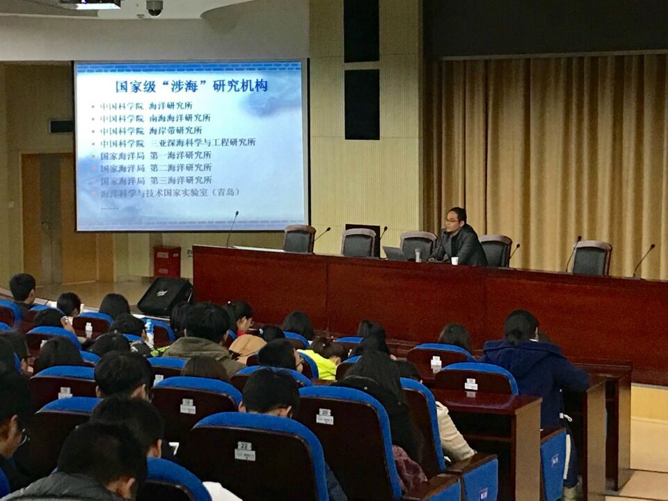 接下来,首期学术报告会举行,申欣教授以《海洋事业,大有作为》为题目,从发达国家海洋发展和我国任重道远的海洋之路入手,向大家展示了海洋对人类发展的重要意义。从各高校纷纷“下海”的数据分析,告诉同学们海洋专业蕴藏着的巨大机遇。在谈及海洋在地球的分布时,他向大家提问:“海洋是什么?”同学们纷纷答道:“海洋是个百宝箱!”、“海洋是生命的起源”……申院长点头认可,并总结道:“海洋是资源的宝库、交通的要道、风雨的故乡、生命的摇篮。”