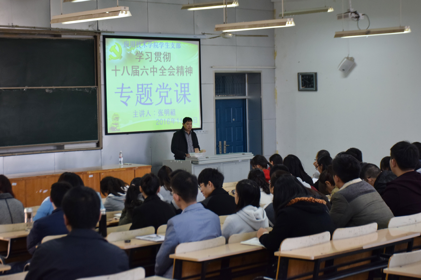 为了及时准确地把党十八届六中全会精神传达到每一位党员,2016年11月3日下午,应用技术学院学生党支部开展了学习贯彻十八届六中全会精神专题党课,由学生第一党支部书记张明祖主讲,他以党的十八大以来,中央全面从严治党的总体布局作为背景,到十八届六中全会主要精神及其历史意义进行了比较全方位的解读,他认为特别是通过了《关于新形势下党内政治生活的若干准则》和《中国共产党党内监督条例》,完成了全面从严治党的顶层设计,释放出从严治党的最强音,必将为巩固中国共产党的执政地位、增强中国共产党的执政能力,为实现十八大确定的总任务、总布局、总目标,提供更加坚实的制度保障。