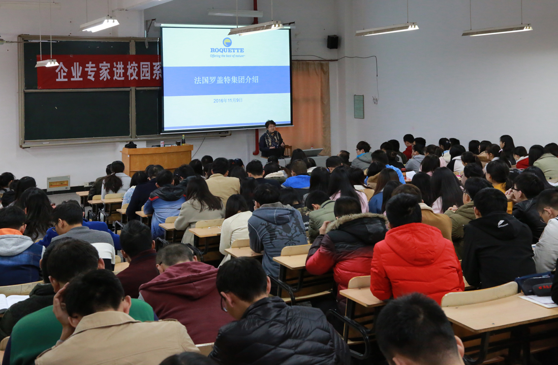 樊院长对各位专家进行了介绍,对他们的到来表达了热烈欢迎。讲座开始,张部长用轻松幽默的方式,对罗盖特集团的创始和历史发展进行了介绍。其次,由张部长特别邀请到场的企业权威专家李经理为同学们详细讲述了企业详情。李经理先从连云港工厂的发展过程和覆盖范围讲起,详细讲解了关于“玉米转化为淀粉再到液体粉木糖醇”的生产过程,对企业的产品在营养健康和医学上的实际应用举例说明,并提出问题。现场同学们讨论热烈,气氛非常活跃。最后,张部长阐述了企业的社会责任,分析了该企业可以长期强大发展的原因并对同学们的毕业形势做了具体分析,给出中肯建议,赢得了同学们的阵阵掌声。