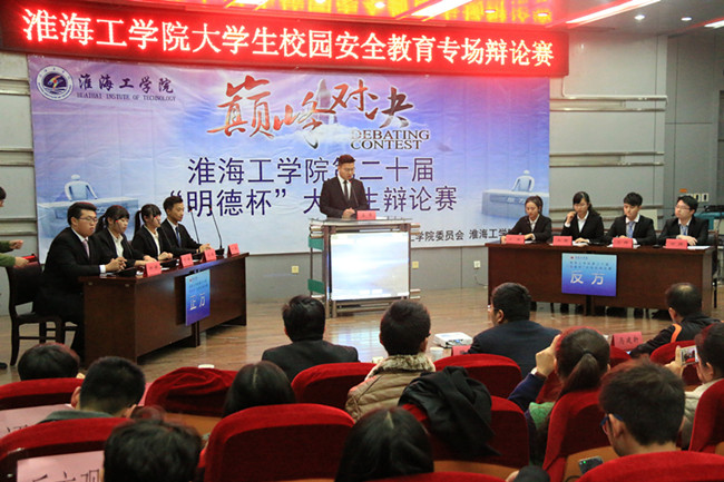 11月9日晚,淮海工学院大学生安全教育专题辩论赛在苍梧校区艺术楼报告厅成功举行,保卫处、党委宣传部、学生处以及团委等部门负责人和近300名学生现场观看比赛。