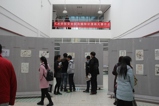 为进一步做好大学生安全教育工作,教育引导学生增强防骗意识和提升自我安全防护能力,艺术学院成功举办了防范诈骗安全教育漫画大赛,对大赛中的优秀作品在艺术楼一楼展厅进行了集中布展,吸引了许多师生驻足观看。