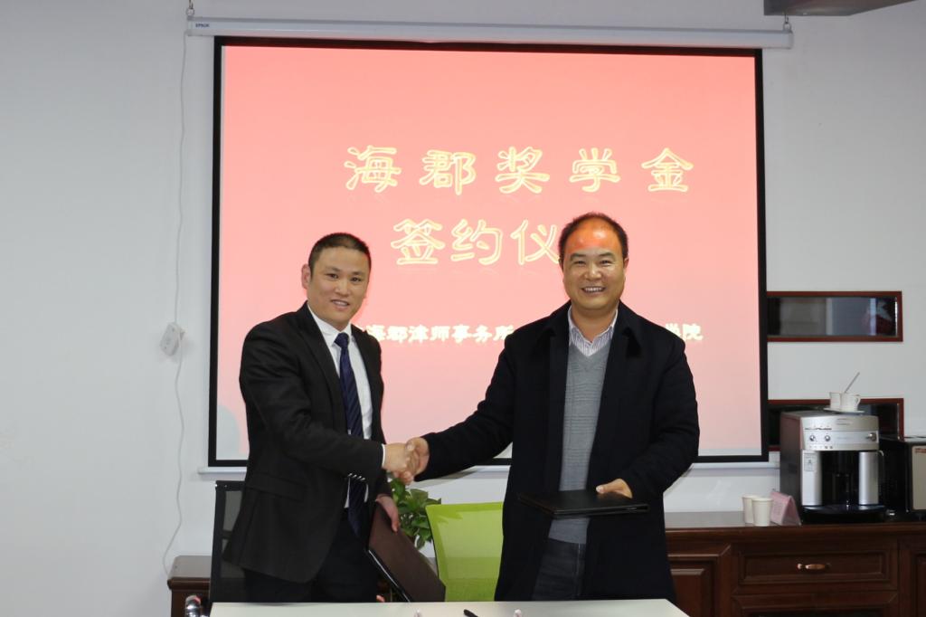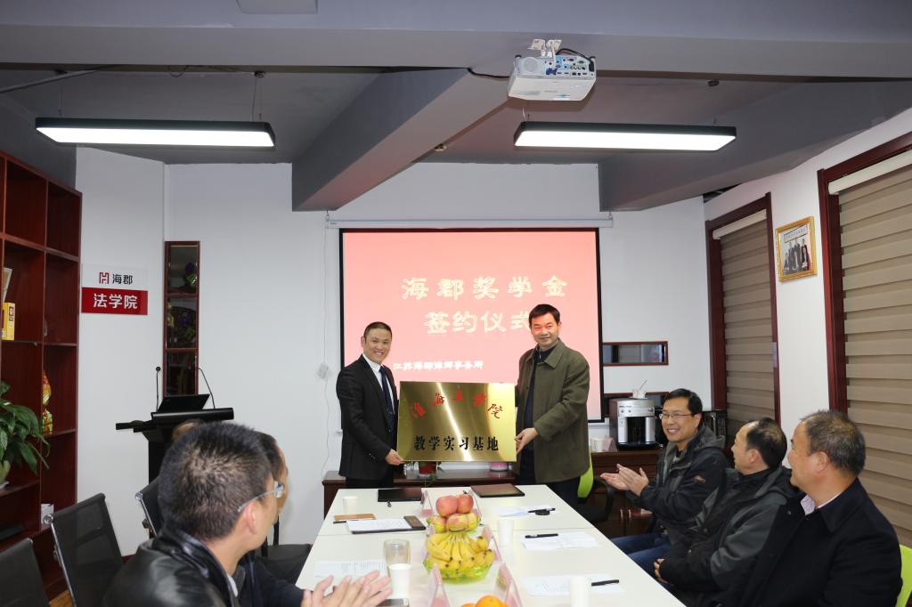 12月5日下午,法学院与江苏海郡律师事务所举行“海郡励志奖学金”设立和教学实习基地协议签约仪式。出席仪式的有校学生处汤洪涛处长、法学院党政领导、海郡律师事务所姚德波主任、戴高明副主任等相关人员。