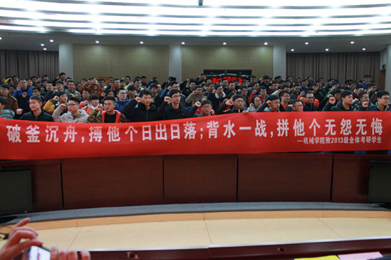 “破釜成舟,搏他个日出日落;背水一战,拼他个无怨无悔!”12月7日下午4:30,机械工程学院在黄海厅成功举行2013级学生考研誓师大会。院长文西芹、党委书记毛纪登、副书记赵求勇、副院长赵明光、张元良、陈劲松出席了本次大会。各系主任、辅导员、毕业班班主任以及全体2013级考研学生准时参加了此次会议。
