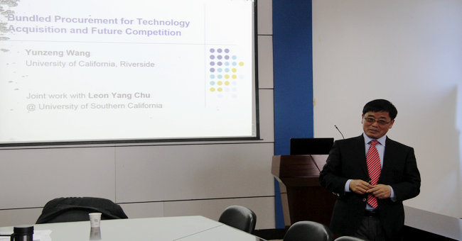 12月14日下午,美国加州大学河滨分校王云增教授在商学院会议室,做了一场题为“Bundled Procurement for Technology Acquisitionand Future Competition”的学术报告。国际交流与合作处副处长韩小杰、商学院教师40余人参加报告会。