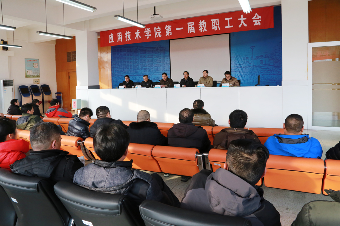 12月28日下午,应用技术学院第一届教职工大会在大学生学业导航中心会议室召开。校工会副主席吴良军同志出席会议并致辞,应用技术学院党委书记周清华主持会议,院长樊华作工作报告,党委副书记、副院长万金店,副院长张根友、沈加君出席会议。全院教职工46人参加会议。