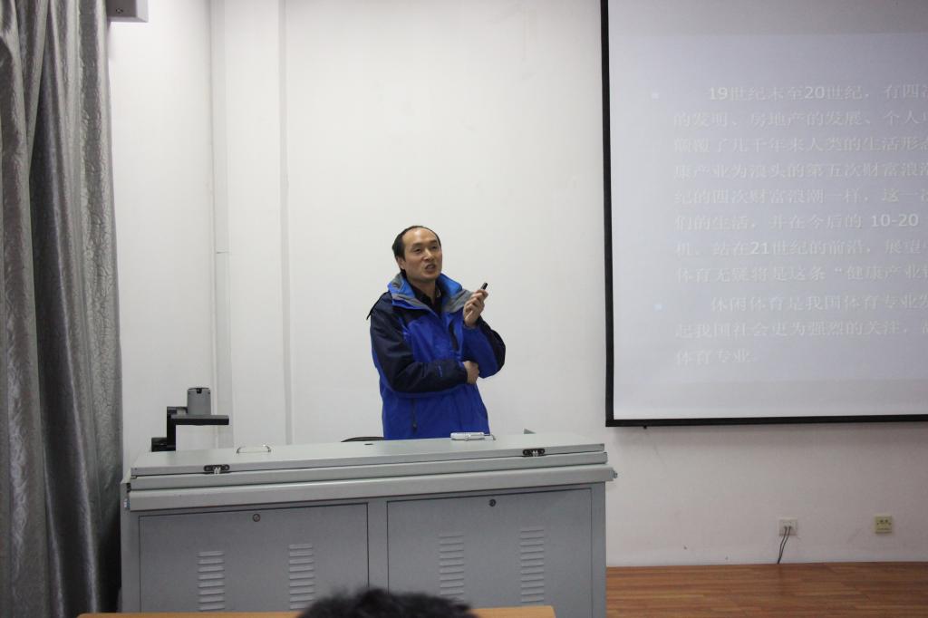 2017年3月7日晚上7点,湖南财政经济学院体育学院院长、博士后、教授戴永冠受体育学院的邀请,在体育学院212多媒体教室为休闲体育系学生做体育专题讲座。体育学院院长周庆功、副院长张伦厚出席讲座,休闲体育系主任、各公共体育教研室主任以及全体休闲体育学生参加讲座学习。
