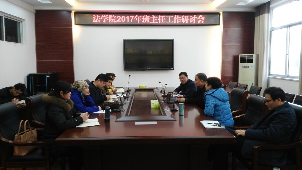 3月8日下午,法学院在文渊楼216会议室召开2017年班主任工作研讨会,法学院党总支书记朱国良、党总支副书记、副院长黄金虎及全体辅导员、班主任老师参加了研讨会。