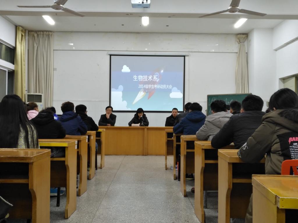 为进一步加强学风建设,帮助2014级学生尽早树立考研目标,坚定考研决心,3月13日晚七点,海洋生命与水产学院在海洋北楼308会议室召开了生物技术系2014级学生考研动员大会。学院党委副书记唐瑶、生物技术系主任王洪斌教授、班主任李士虎老师及专业辅导员参加了本次动员会议。