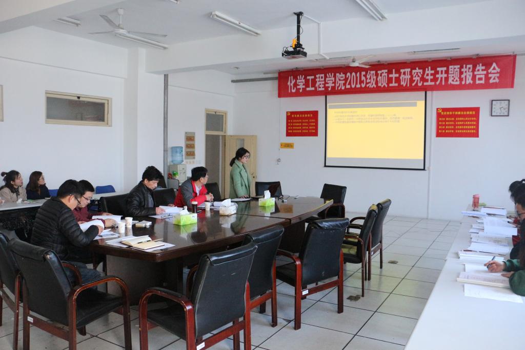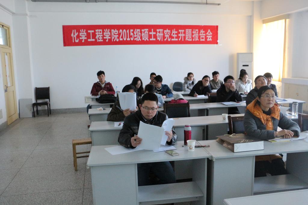 3月17日下午,化学工程学院“化学工程与技术”硕士点2015级研究生开题报告会在教学主楼如期举行,13名研究生参加并汇报了各自的研究课题, 2016级12名研究生参加学习。报告会分为两组,分别由化学工程学院院长童志伟教授和副院长张东恩教授担任组长,李树安教授、张珍明教授、刘霖副教授、陶传洲副教授及药学院副院长马卫兴教授、宋晓凯教授担任此次报告会的评审专家。