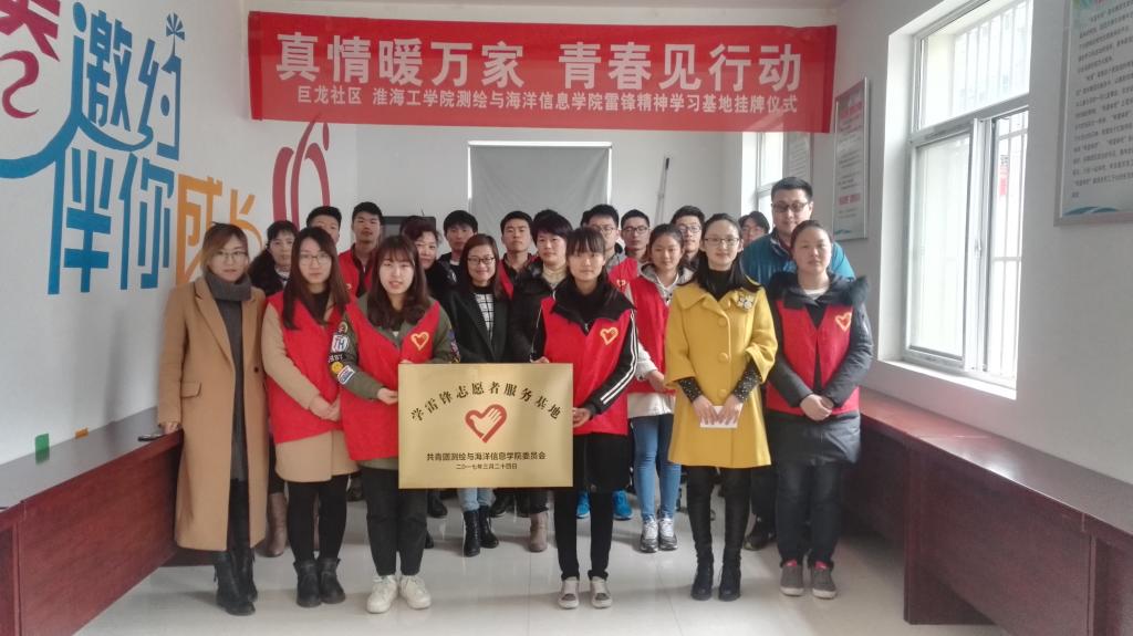 3月24日,测绘与海洋信息学院学雷锋志愿服务基地揭牌仪式在连云港市巨龙社区隆重举行。连云港市新东街道党工委员李晶、测绘与海洋信息学院团委副书记周小晓、巨龙社区书记程荣荣、主任单宏吉以及志愿者们等参加了揭牌仪式。
