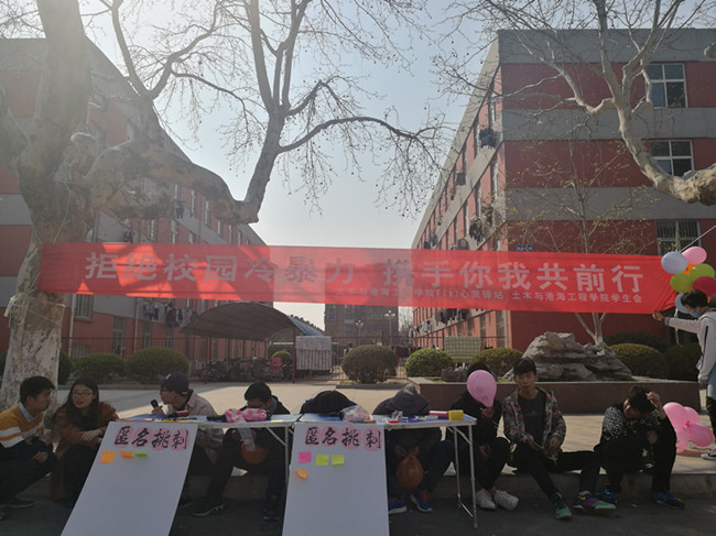 3月27日下午,“拒绝校园冷暴力,携手你我共前行”的心理健康教育活动在通灌前程餐厅门口成功举办。本次活动由土木f(x)心灵驿站与土木学生会共同举办,辅导员卞辉老师、唐毅老师参加了该活动,本次活动得到了连云港电视台的采访,在校园内引起热烈的反响。