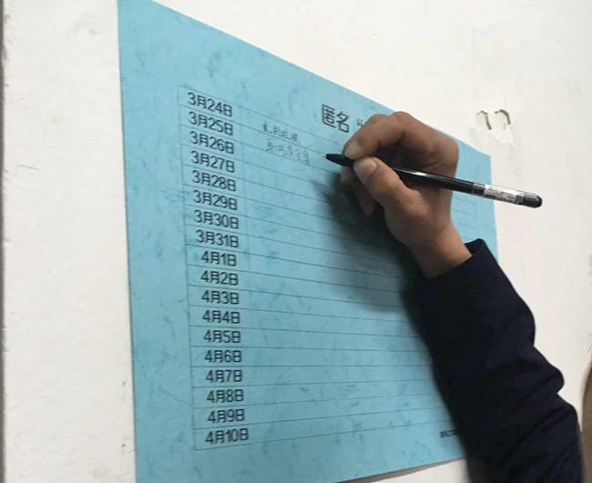 此外,在土木164班的宿舍墙上,还贴了创意十足的“匿名挑刺墙”,舍友可以在任何时候匿名写下对舍友的意见和建议,从而缓解并和谐舍友之间的关系。