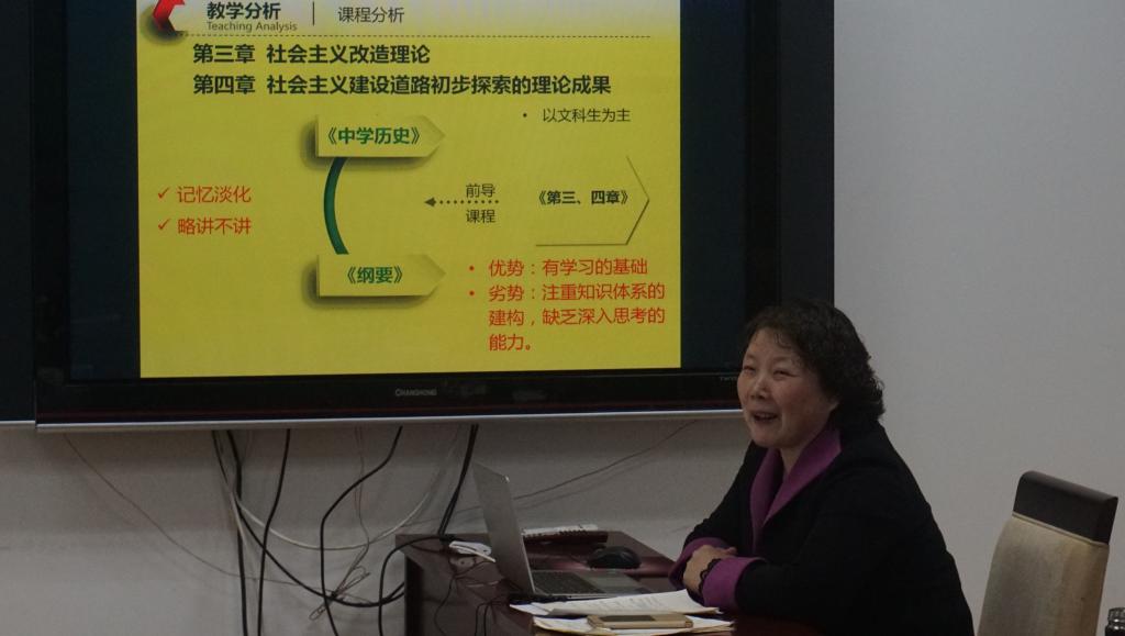 首先,朱凌云老师为大家做了《20世纪50年代中国为什么选择社会主义道路?》的课堂教学展示。朱老师介绍了此次课程设计的总体思路,通过专题设置、角色扮演、小组讨论、课堂辩论、教师点评的方式让学生加强对本段历史的记忆和理解。朱老师的课程设计完整,教学方法新颖,教学内容话题性强,得到了在场教师的好评。