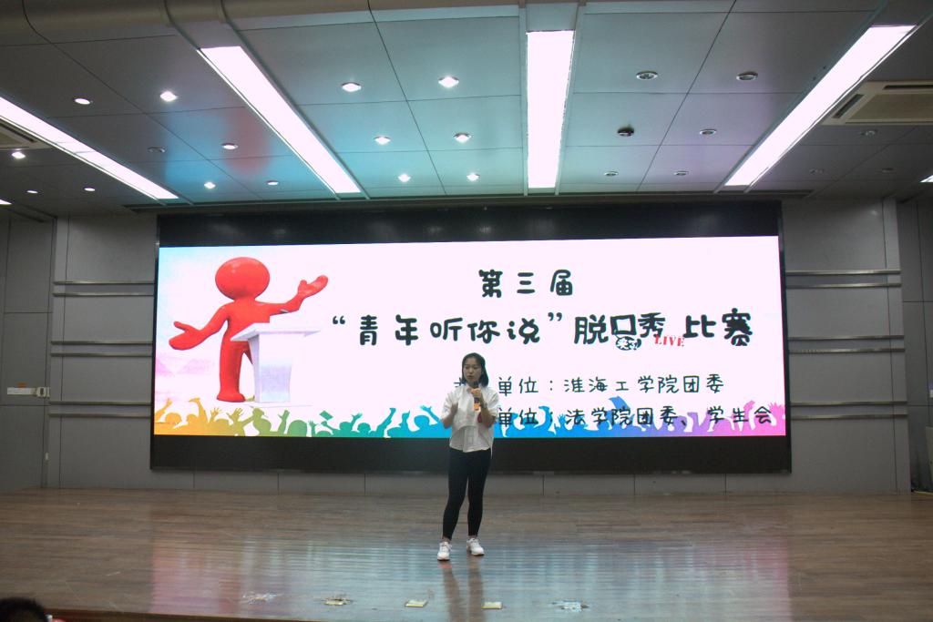 5月4日晚,由淮海工学院团委主办,法学院团委、学生会承办的第三届“青年听你说”脱口秀大赛决赛在艺术楼报告厅成功举行,经过层层选拔,共有10位选手脱颖而出进入决赛。连云港日报网络传播中心主任胡柳君、校团委副书记朱小明、马克思主义学院副院长沈春梅、法学院党总支书记朱国良、法学院党总支副书记、副院长黄金虎以及法学院辅导员崔家新、蒋莹莹、周韵娴担任此次比赛的评委。