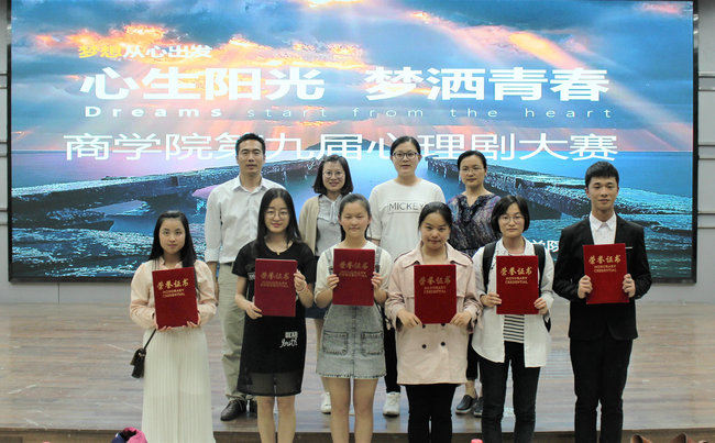为了在丰富学生精神文化生活的同时充分引起其对心理健康的重视,商学院第九届“心生阳光,梦洒青春”校园心理剧大赛决赛于5月17日晚在本部艺术楼报告厅拉开了帷幕。商学院党委副书记张振松、学工办主任徐建芬以及各专业辅导员受邀担任了本次大赛的嘉宾和评委。