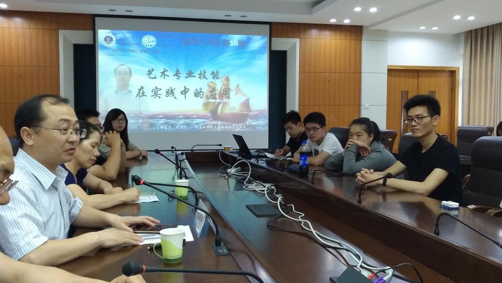 沈兴华首先作了题为“艺术专业技能在实践中的应用”的讲座,他在讲座中向学弟学妹们阐明了养成认真细致做事习惯的重要性,指出文字使用要规范,软件使用要熟练,尤其是要注意培养高效完成任务的素养。他指出任何设计作品都要考虑系统化、科学化、衍生化,要融入设计师的理念。他认为产品一定要表达出“美”,尤其是与环境和使用者体验融为一体的“无觉之美”,能够在结构、外观、使用习惯等方面形成协调与和谐。沈兴华认为中国传统文化博大精深,产品的设计一定要借鉴文化,体现文化,在尊重传统文化的基础上重视时尚需求。他还就苏绣中的“小猫戏蝶”图进行了解读,指出该图其实是取其谐音,寓意为“耄耋”之意,意在祝福老年人身体健康、延年益寿。他认为作为艺术设计者,要想成为大家,对事物和产品进行积极向上的解读是高层次的境界。沈兴华还介绍了中国的数字文化的重要性,建议作为设计类从业人员,师弟师妹们一定要好好研究中国的文化历史,充分理解和善于使用这些文化传统在产品与人的情感互动中的独特作用。讲座后,沈兴华同师弟师妹们进行了自由交流,耐心回答了同学们提出的设计思想、创业、人生选择等方面的问题。为表达对学长的敬意,2015级学生曹祚代表艺术学院向沈兴华赠送了水晶印章,沈兴华高兴地接收了这份礼物。讲座最后,师生陪同沈兴华一起合影。
