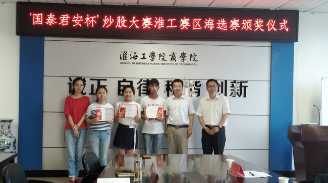 6月23日下午,由商学院承办的“国泰君安杯”炒股大赛淮工赛区海选赛颁奖仪式于苍梧校区主楼606举办。国泰君安江苏分公司连云港营业部总经理庄庆超、商学院党委副书记张振松、商学院辅导员程雪、海选赛获奖选手、金融协会以及国贸协会等30余位成员参加了颁奖仪式。仪式由张振松主持。