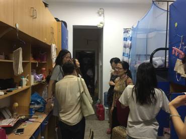毕业生们看到老师们冒着这么大的风雨来到宿舍,连称想不到。有同学说,以为风大雨大老师们不会来了,结果还是出现了,说明艺术学院领导老师心中有学生,说明艺术学院是一个温暖的群体。看到马上要离校的同学,老师们会叮咛一句“一路顺风,多回来看看”,充满真情的话语,丝丝温暖了毕业生的心。很多毕业生拉着老师的手,竟无语凝噎,留下不舍的泪水,伴君四年,终有一别。老师们也思绪万千,纵有不舍,也需送别。宿舍楼里弥漫着淡淡的离别忧伤,但是经过四年的磨炼,未来的设计师们已小禾初成,广阔的天地在等着你们搏击,是时候出发了!艺术学院会永远做你们身后最强大的支柱!