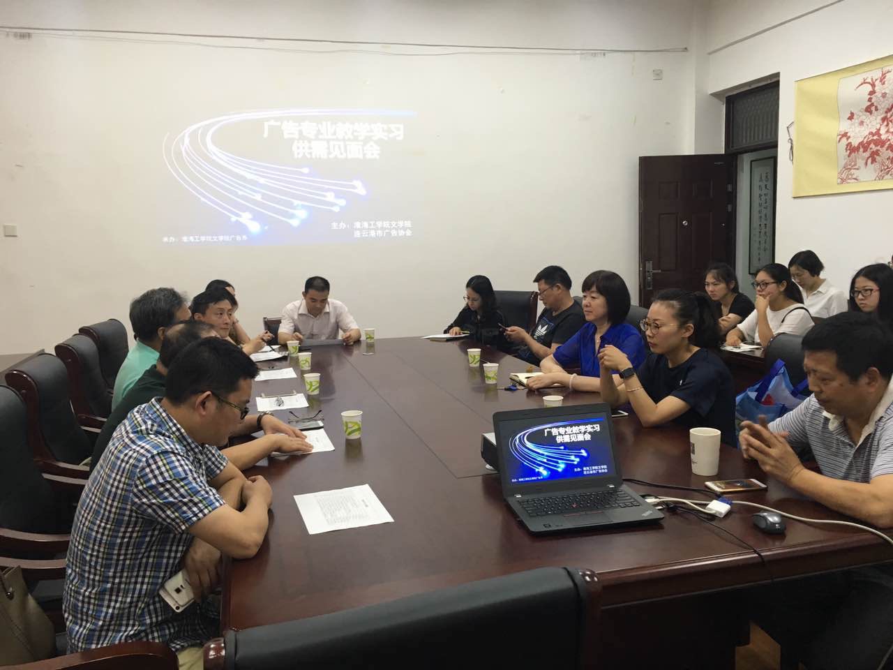 文学院和连云港市广告协会联合主办广告专业学生教学实习供需见面会于2017年6月29日上午在淮海工学院文渊楼306会议室召开。主管实践教学的文学院副院长、市广告协会会长、秘书长、以及连云港8家广告企业负责人,广告系实习指导老师和实习学生出席会议。