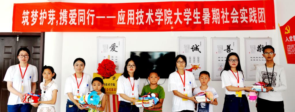 应用技术学院暑期社会实践团的学生代表向宋跳社区留守儿童捐赠了精心准备的图书、文具、笔记本等文体用品。拿到礼物的小朋友们非常开心,并立志好好学习、天天向上,等长大了也要向哥哥姐姐们一样去做社会实践活动。万金店、陈姝含还与朱源进行了深入的交流,进一步商讨暑期实践团的活动部署工作。