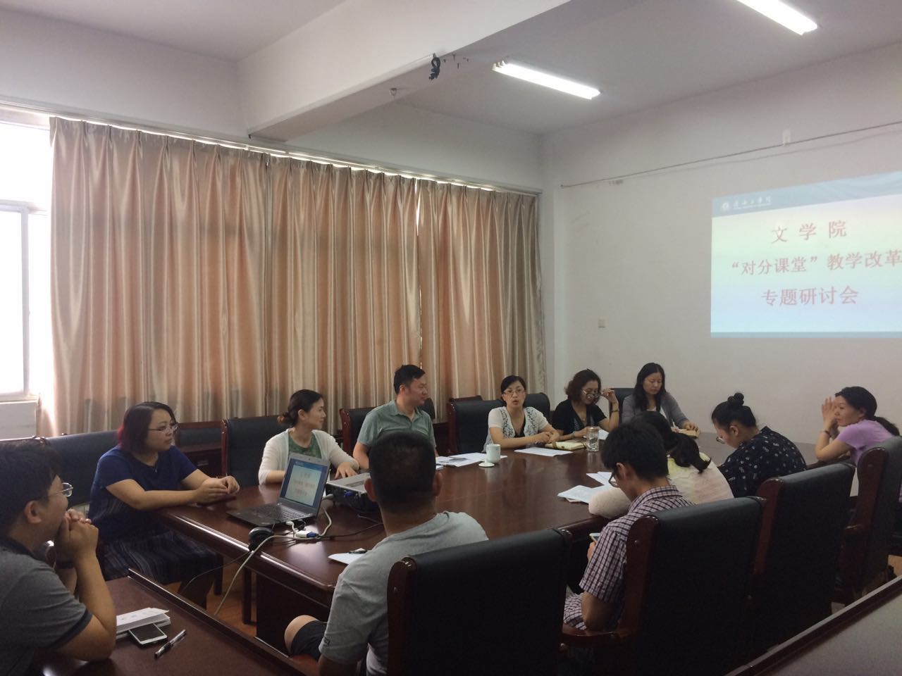 7月5日下午,文学院落实学校《关于试点推进“对分课堂”教学改革工作的通知》和“‘对分课堂’教学改革推进会”精神,不断推动教学改革,提高课堂教学效果,在学院会议室组织10余位教学骨干召开“对分课堂”教学改革专题研讨会,教务处副处长赵巍应邀出席。会议开始,赵处长介绍了此次改革的背景及重要意义,并为参会的教师们做了《“对分课堂”微信平台——“对分易”的应用》分享。教师们结合课程性质和自身教学体验踊跃地展开了讨论。