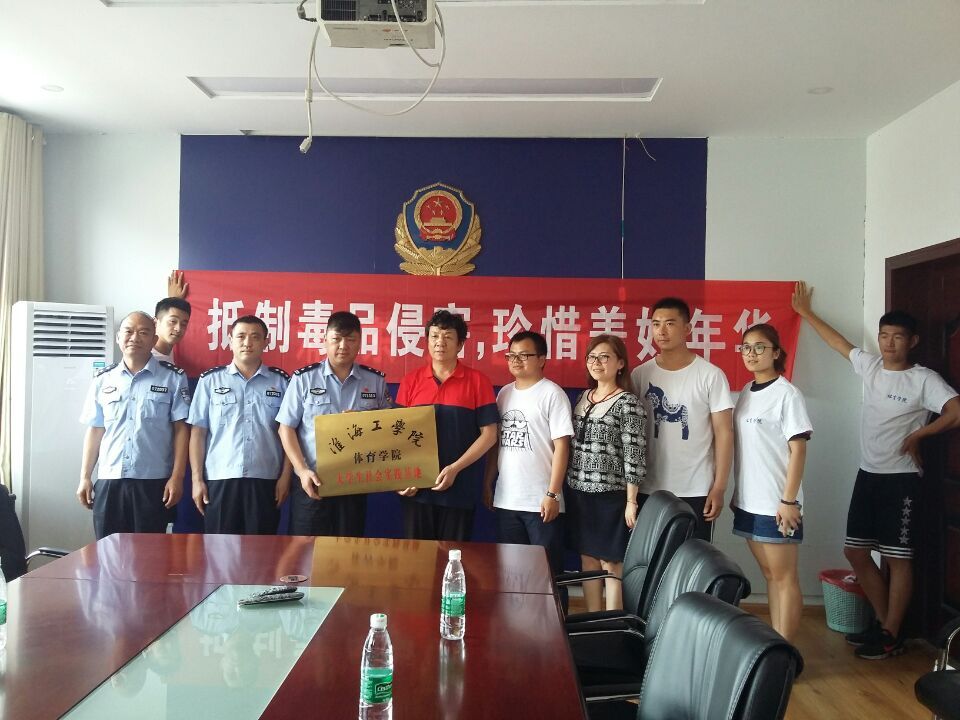 7月7日,体育学院大学生社会实践基地挂牌仪式在连云港市公安局海州分局禁毒大队隆重举行。为了与市公安局海州分局禁毒大队形成长效合作,为青年大学生营造“无毒”的健康生活环境,体育学院“生命光华”暑期社会实践小分队肩负重任,必须全力迎接挑战。在校后勤管理处徐莉老师和体育学院分团委书记武传钟的带领下,“生命光华”暑期社会实践小分队全体队员们与连云港市公安局海州分局禁毒大队的警官们开展交流活动,禁毒大队队长杨再兴警官为参加社会实践的同学们耐心讲解了警务人员的日常工作内容,介绍了很多关于毒品的知识,让同学们明白了毒品的危害性。社会实践小分队在与警务人员的相互交流中了解到禁毒大队工作人员的敬业与辛苦,了解毒品对自身、家庭及社会的危害性,做到远离毒品从自身做起。