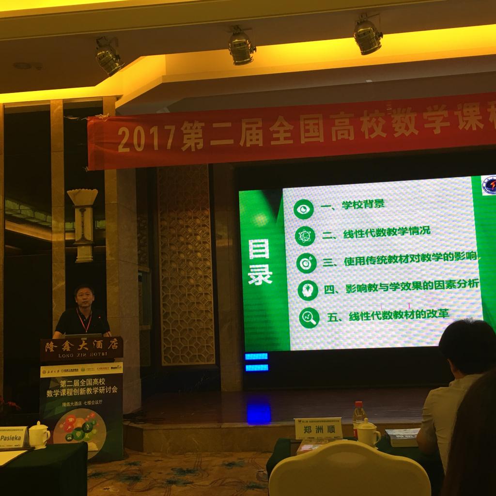 应《第二届全国高校数学课程创新教学研讨会》组委会邀请,8月4日,理学院董晓波教授作为特邀报告人做了《体系与展示形式的借鉴和吸纳——线性代数教材改革的一点探索》的报告。报告中,他向与会代表介绍了我校《线性代数》教学的现状,系统分析了以往一般《线性代数》教材存在着:“学本脱节,体系生硬,抽象繁琐,展示单一”的问题,对教学效益的提升形成了巨大的阻碍;重点介绍了十年来我校《线性代数》教学团队老师围绕着“如何体现理论与应用的无缝衔接,如何实现通俗易算,如何实现师生教与学的双高效,如何实现对师生教与学的全方位帮助”等方面进行的《线性代数》教材改革情况。报告中,还与参会老师分享了我校《线性代数》教材在借鉴和吸纳国内外先进教材的基础上,在“教材布局”,“内容导引”,“引例开始、应用实例结束”,“MATLAB软件嵌入各章知识点”,“使用新媒介交互平台”,“教材留白”,“微课导学视频”等方面教材改革取得的成果。报告中,董教授严谨的分析、形象生动的语言,团队老师长期坚持不懈地教学探索,以及教材改革取得的成果,引起了参会同行们的强烈反响。